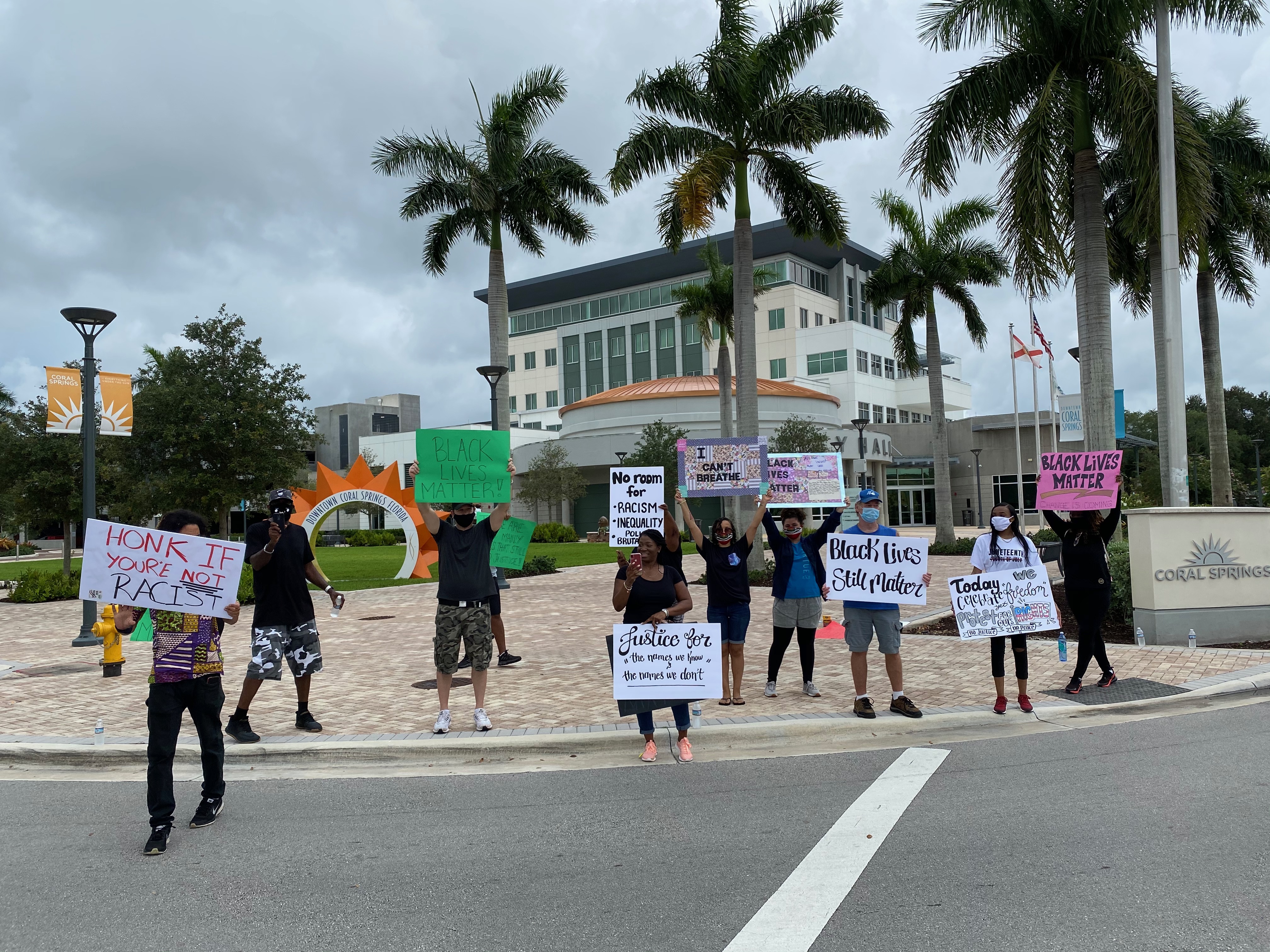 A group of citizens holding Anti-Racism signs and supporting Black Lives Matter gathered in front of Coral Springs City Hall today. They were greeted by regular honks from drivers passing by showing support.
