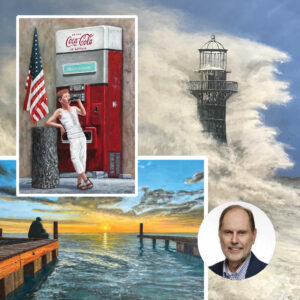 Since then, Haley’s work has gone on to win at least eight major art competitions, including First Place in the “Nature 2022” international juried painting competition conducted by Artorful for his painting “Intrepid,” depicting a froth of white water engulfing a lighthouse in a storm; Finalist Award in the 2022 Color International Juried Art Competition for “Wire Fence,” a barbed-wire fence in the foreground of a pink and orange crepuscule sky; and “Enduring,” which won third place out of hundreds of submissions in Artorful’s BlueOrGrey 2022 Art Competition. It now belongs to a collector in Naples.